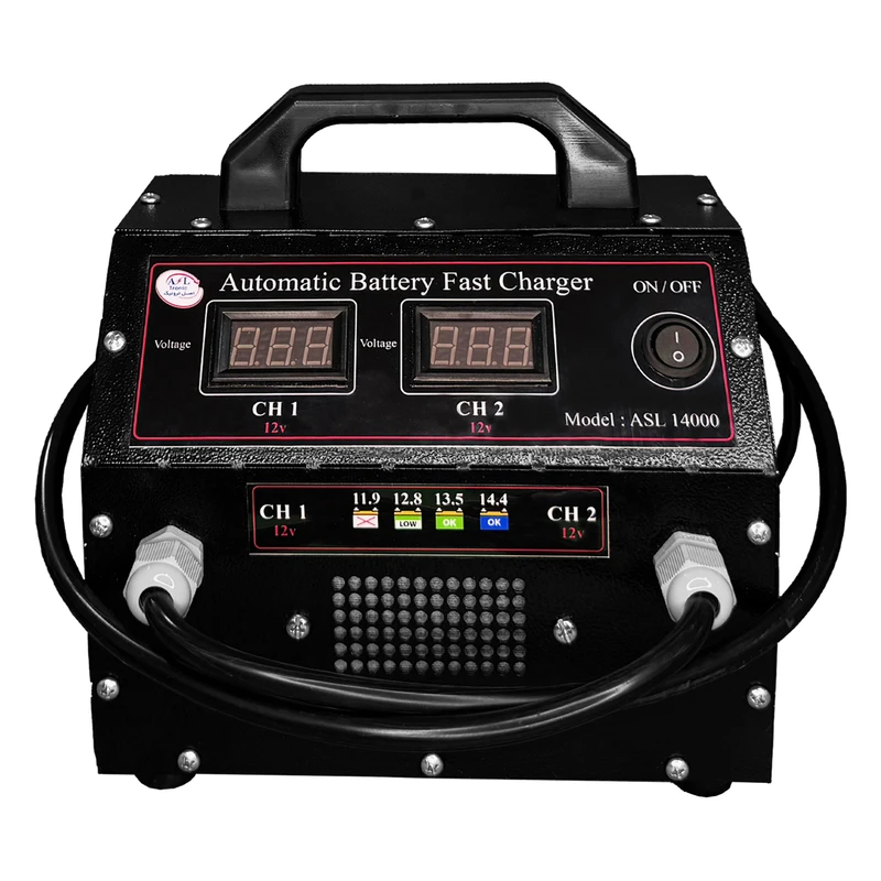 شارژر سریع و اتوماتیک انواع باتری های خودرویی، موتوری و یو پی اسی. شارژ همزمان 2 باتری 12 ولت ( برای خودرو های سنگین که دارای 2 باتری 12 ولت هستند می توان تک تک باتری ها با کانال شارژ جدا و مستقل شارژ کرد).