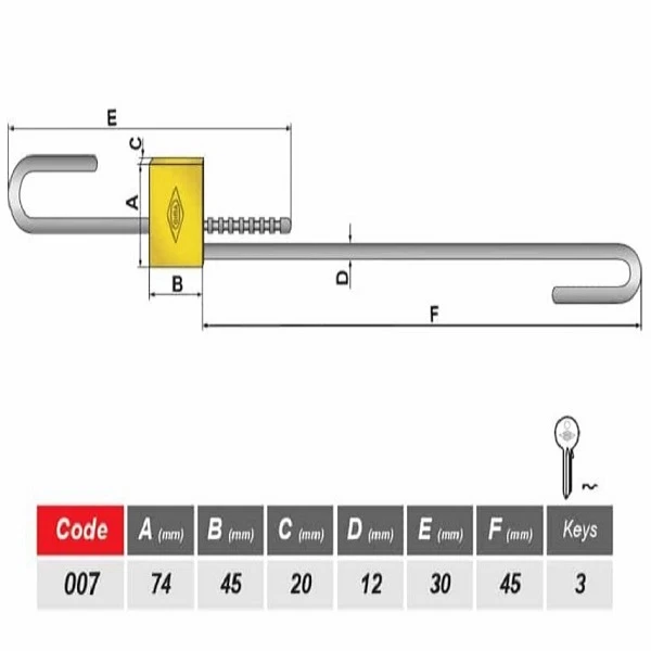 قطر مفتول قفل 12 میلیمتر و ابکاری شده بوده و حداقل طول قفل در حالت بسته 4 سانتیمتر و حداکثر طول قفل در حالت باز 10.5 سانتیمتر میباشد.این قفل دارای 3 کلید معمولی و ابکاری شده میباشد