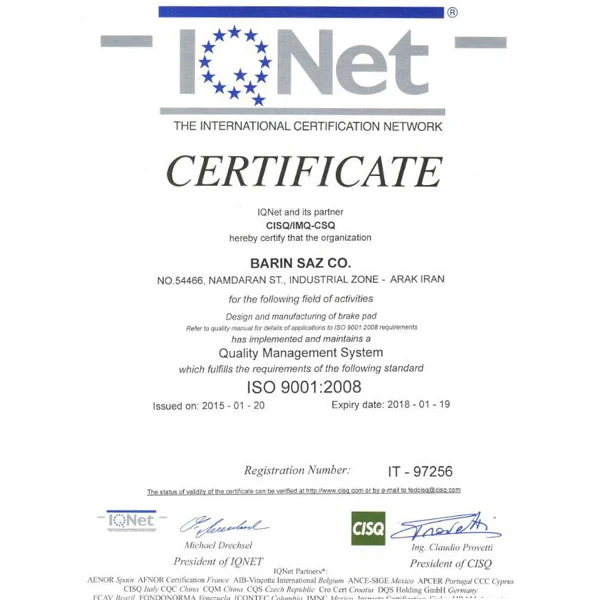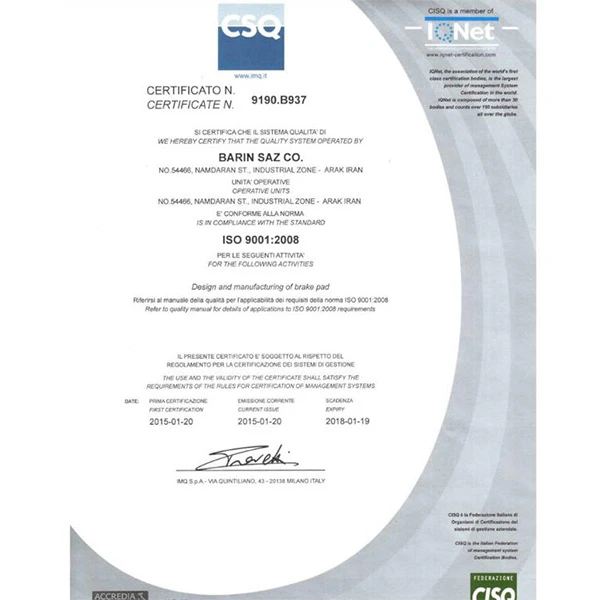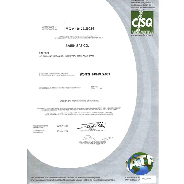 کارخانه تامین کننده لنت های پاسیکو دارای علامت استاندارد ایران ، گواهینامه استاندارد بین المللی مدیریت کیفیت قطعات خودرو از IMQ ایتالیا ، گواهینامه سیستم مدیریت کیفیت ISO 9001 از CSQ ایتالیا و گواهینامه بین المللی کیفیت از IQNET ایتالیا می باشد.