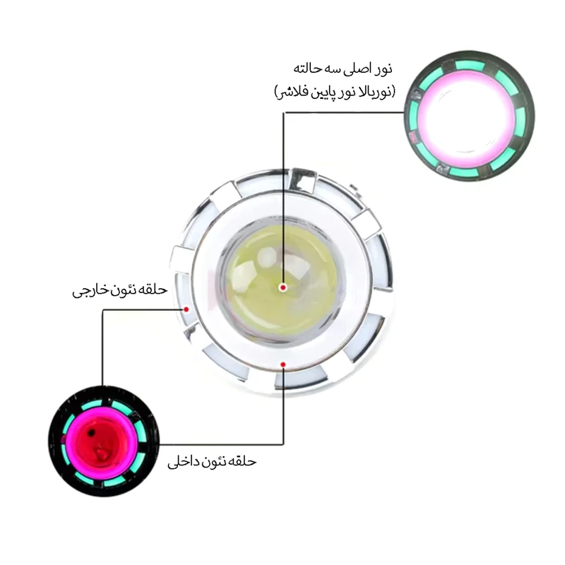 این محصول شامل یک عدد لنز چراغ مخصوص موتورسیکلت می باشد، و دارای دو ردیف نئون ال ای دی با نور یکدست و زیبا و لامپ اصلی نیز ال ای دی با شامل سه حالت نوربالا، نورپایین و فلاشر می باشد. داخل لنز نیز یک عدد ال ای دی دویل آی با رنگ قرمز جهت زیباتر شدن لنز در حالت خاموش بکار رفته است.