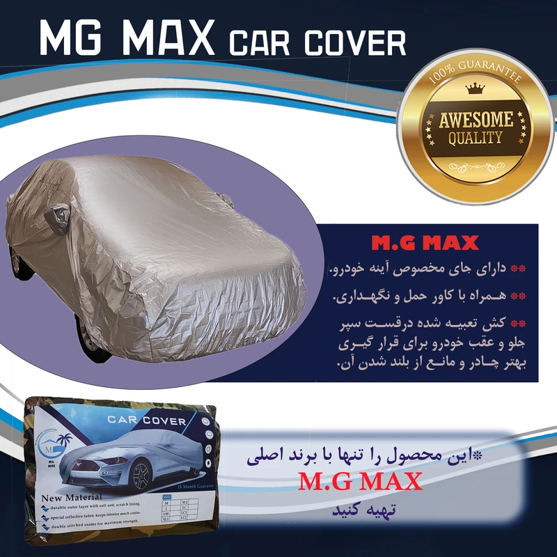 این محصول در تمامی فصول سال ، خودرو را از گرد و غبار و بارش باران محافظت می کند. روکش این نوع چادرهای نسل جدید از جنس نانو شمعی میباشد که دارای بافتی خاص و ظریف هستند و همین امر باعث سهولت و آسانی در استفاده محصول و کم حجم بودن مخصوصا برای قرار گیری داخل صندوق عقب شده است ، اگر خودرو شما به صورت مداوم در معرض نور آفتاب و شرایط بد آب و هوایی مانند برف و باران باشد، این امر منجر به آفتاب سوختگی رنگ خودروها و یا زنگ زدگی بدنه می شود. از طرفی دیگر ضرر آفتاب، برای الیاف پارچه ای روکش صندلی خودروها یا روکش های چرمی آن ها نیز آسیب زاست و می تواند عمر آن ها را تا حد زیادی کاهش دهد. علاوه بر این در سایر ، برای در امان ماندن از مضرات تابش آفتاب، کثیفی و گردو و خاک بر روی خودرو ، این نوع چادرهای موسوم به نانو در اختیار خریداران عزیز قرار دارد که بسته به انواع سایز خودرو ها موجود می باشد. این نوع چادر های خودرو دارای خاصیت های ضد آب، ضد خش، ضد آفتاب ، ضد خاک و شست و شوی آسان هستند. در واقع یک چادر ضدآب خودرو برای آنهایی که نگهداری و حفظ ظاهر خودرو برایشان اهمیت دارد، ضروری است. چادر ضدآب خودرو یک راه ساده و موثر برای حفاظت بدنه ی خودرو در برابر خط و خش و تغییر رنگ است. چادر ضد آب خودرو از یک لایه ی مخصوص بهره می برد که مقاوت آن در برابر نفوذ آب را تا حد زیادی بالا برده است. علاوه بر این یکی دیگر از مزایای چادر ماشین ضد آب کاهش هزینه هایی است که برای کارواش پرداخت میکنیم تا همیشه اتومبیل تمیزی داشته باشیم ، این چادر خودرو در بسته بندی زیبای طرح چریکی ارتشی و با بسته بندی رسمی برند ام جی مکث در درجه کیفی A+ تقدیم و ارائه عزیزان می شود.