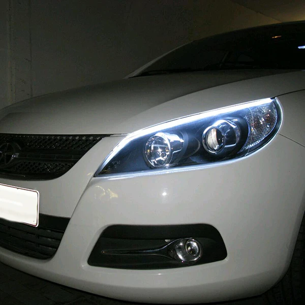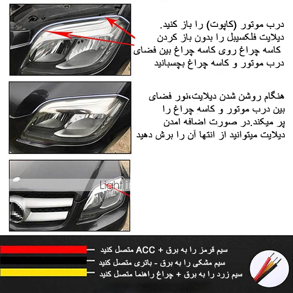 دیلایت انعطاف پذیر نئونی دو حالت محصولی بسیار جذاب و پرطرفدار است.این دیلایت به سادگی بر روی کاسه چراغ نصب میشود.به دلیل ضد آب بودن آن نیازی نیست کاسه چراغ باز شود و داخل کاسه چراغ نصب شود.این دیلایت بسیار نازک بوده و به همین دلیل بر روی کاسه چراغ در فاصله درب موتور و کاسه چراغ نصب میشود.دو طرف این دیلایت نئونی چسب آماده وجود دارد و به این صورت در عرض 5 دقیقه به راحتی میتوانید آن را نصب کنید.این دیلایت دارای راهنمای متحرکت میباشد به این معنی که وقتی راهنما را استفاده میکنید این دیلایت با افکتی خاص روشن و خاموش میشود.طول هر عدد از این دیلایت ها 60 سانتی متر میباشد که بر روی تمامی کاسه چراغ های خودروهای ایرانی و خارجی قابل نصب است.چنانچه هر مقدار از این دیلایت اضافه بیاید به راحتی از انتها میتوانید برش دهید.این دیلایت در مجموعه دو عددی میباشد یعنی دو دیلایت که هر کدام 60 سانتی متر میباشد.این دیلایت دارای 3 عدد سیم میباشد.سیم مشکی آن به برق منفی باتری – سیم قرمز آن به برق مثبت متصل میشود که باعث روشن شدن رنگ سفید دیلایت میشود و سیم نارنجی به برق مثبت راهنما متصل میشود.به این صورت هنگام زدن راهنما،رنگ سفید دیلایت خاموش میشود و با افکت متحرک رنگ نارجی شروع به چشمک زدن میکند.