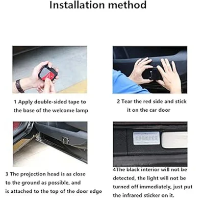 برای نصب این محصول زیر درب خودرو با گردبر مخصوص که همراه محصول می باشد سوراخکاری شده با استفاده از مته سوراخی به قطر حدود ۲ سانتی متر را در زیر درب و یا قسمت انتهایی رو در ایجاد کنید ولکام لایت زیر در پیچ و فیکس میگردد و سپس سیم آنرا به کلید لای در وصل میکنید در اینصورت با باز شدن درب خودرو لوگو بصورت کاملا واضح (حتی در روز) روی زمین نقش میبندد، جهت نصب می توانید به باطریساز یا برقکار خودرو مراجعه نمایید.