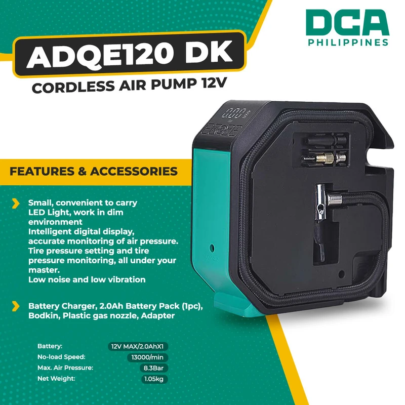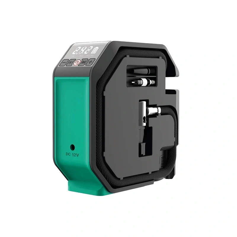 پمپ فندکی چندکاره با تغذیه 12 ولت از آداپتور و باتری لیتیومی، مجهز به نمایشگر دیجیتال هوشمند، دارای ترموستات و انواع سوزن و نازل. قابلیت تنظیم فشار باد لاستیک با دکمهها، فشار باد میانگین 3 بار (45 PSI) و ماکزیمم 8.2 بار (120 PSI). موتور با حداکثر سرعت چرخش 13000 دور در دقیقه. |